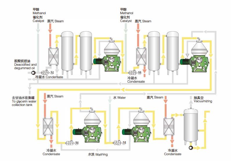 该工艺以油脂为原料,通过添加碱性催化剂,与甲醇发生醚化反应制得生物柴油,反应过程中生成的甘油为副产品。